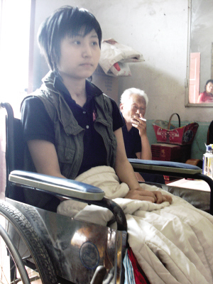 当天下午2时许,记者在陈秋芳的奶奶家,见到了这名22岁、坐着轮椅的花季女孩(如图)。陈秋芳告诉记者,去年中秋节前后的一个凌晨,在广东省东莞市常平镇打工的她从6层高的楼上摔下,被同事送往常平医院。经过抢救,陈秋芳从死亡线上挣扎回来,却因脊椎严重损伤导致胳膊以下失去知觉。除此之外,身体其他部位也多处受伤,至今陈秋芳的脖子和腿部仍有两块钢板埋在体内。去年10月份,已先后花去10多万元医疗费用的陈秋芳被家人接回扶沟老家保守治疗。