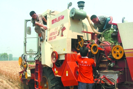 6月6日,在通许县四所楼镇韭菜王村,大新农机公司的维修技术人员正在为一台抛锚的收割机排除故障。为确保农机能正常作业,该县农机经销部门组织了十多台售后服务车,深入机收现场,为农机进行免费维修和调试。 本报记者 杨远高 摄