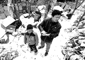 3月15日,徐奥迪和父亲徐成站在捡到钱的垃圾堆旁,讲述捡到巨款的经历。