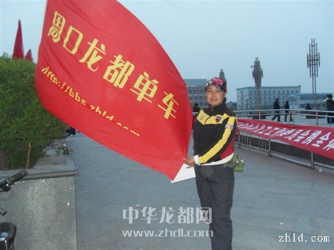 4月18日傍晚,一名网友把“周口龙都单车”旗帜插在五一广场,为祈福活动布置场地。