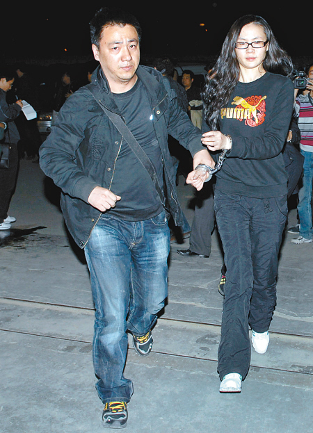 昨晚9时51分,随着一辆车号为陕A6778警的白色桑塔纳警车作为开道车缓缓驶入刑警队,陕A6826警的福特面包车跟在其后。“女的先下!”面包车拉开门,一位女民警和另一名民警先押着女嫌犯下了车,戴着手铐,她低着头,戴着一副眼镜,长发披下来盖住大半个脸。嫌犯被押往刑警队一楼的办公室要经过一个过道,几次被媒体记者“截住”拍摄。现场维持秩序的其他民警不得不大喊:“让一下!”女嫌犯被押往刑警队一楼的一中队室,始终没有抬头。