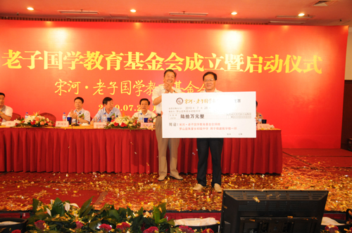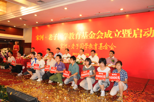 随后,在河南省宋河老子国学教育基金会首批捐助项目启动仪式上,信阳市罗山县朱堂乡初级中学获得60万元的捐助款,用于学校教学楼的改造;周口市第一高级中学获得50万元的捐助款,用于修建国学图书馆。同时,来自全省考入大学经济困难的十名优秀贫困大学生也每人获得了一万元的助学资助。