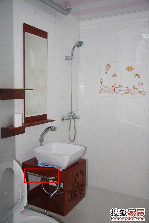 再放大一点。本来这个挂件是安在另一边的,后来我发现从门口看柜子,下面都是管子,太乱了,所以,当场叫师傅给改在靠门这边了,将来挂上毛巾,就OK啦。