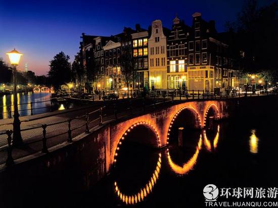 灯光和运河交相辉映,这里已经成为明信片上的风景地,吸引了很多游客来阿姆斯特丹来参观。