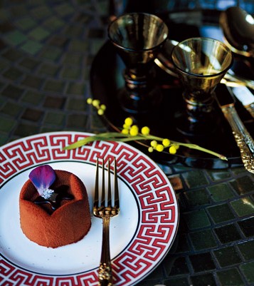 富于融合精神的餐桌造型,带有希腊典型纹样的盘子、坚硬的马赛克桌面以及镶金的餐具组合,制造出古老文明之间的精彩撞击。