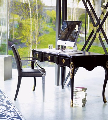 最新出品的法国新古典主义样式写字桌,保持了简洁的外观,气质依旧优雅高贵,拥有干净利落的曲线造型桌腿,点睛的镀金饰件,还有皮革桌面。
