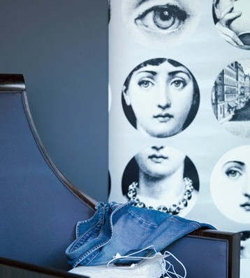 著名意大利品牌FORNASETTI的标志性图案,如今被用于墙纸的设计。与之搭配的是一把典型帝政风格造型的椅子。