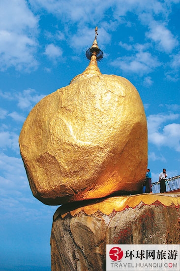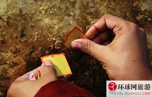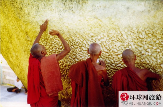巨石的灿烂金身是信徒贴的金箔纸。要想亲手触摸大金石,必须走过一座小桥。有趣的是,只有男性可以穿桥而过,女性严禁通行,因为当地人认为女人会使石头失去神力。我留意到身边的僧侣口中念念有词,不时伸出舌头舔着大金石。一旁还有众多男信徒往石头上“贴金”。据说这块看上去颤巍巍的巨石照片曾被旅行指南《孤独星球》当作封面,算得上是一处奇景。