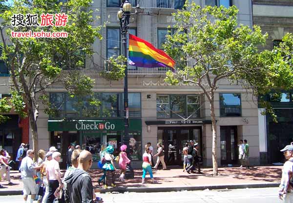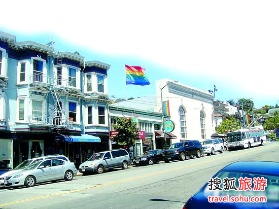 从旧金山的市中心联合广场出发,跳上一辆有轨电车,晃晃悠悠20分钟,就到了位于旧金山郊区的卡斯楚街。刚到卡斯楚街,感觉跟旧金山别的街区没什么两样,不到一公里长的小街,两边满是北欧建筑风格的商店、餐厅、咖啡馆。但细细一看,就能瞧出些端倪来。我们到的当天正好是美国国庆日,但卡斯楚街满街没有多少美国国旗,倒是挂满了红、橙、黄、绿、青、紫六种颜色组成的“彩虹旗”,这是同性恋的标志旗帜。在街道入口处,一幢六层楼高的建筑尖顶旁,竖着一面巨幅的“彩虹旗”,美国国旗也只能在它的一边当陪衬,街道两边的民宅和商店,到处都有直愣愣地伸出随风飘舞的“彩虹旗”。