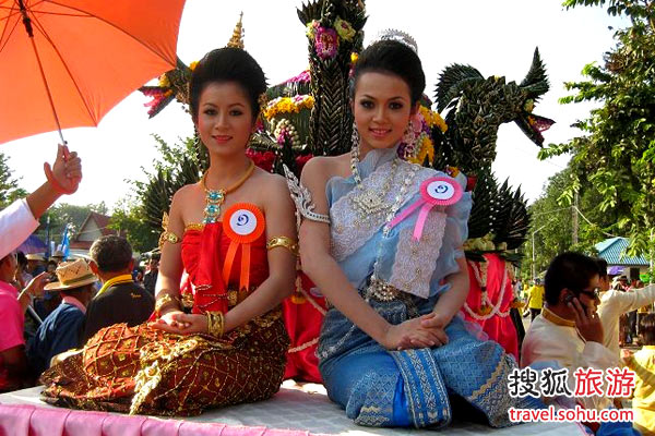 花车游行,也为节日生色不少。游行队伍从市中心一路游到河畔,桥头的转弯处地方宽畅,自然成为花车队伍的表演中心。十六七岁的小妮子画起妆来穿上传统泰国民族服饰,手持花伞边走边舞,个个几乎都是最上镜的泰国小姐,随时都可走上国际舞台。