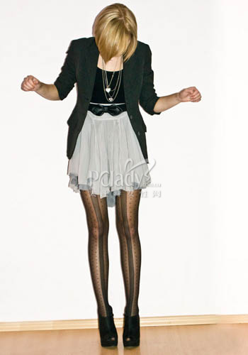 拼接丝袜,有黑色条纹做延伸,可以让腿看起来更长些。带着轻摇滚风的丝袜,搭配高腰纱裙,将少女的甜美和摇滚风的叛逆巧妙融合,带来不同一般的时尚感觉。这种Look与泰勒-莫森的风格很类似。