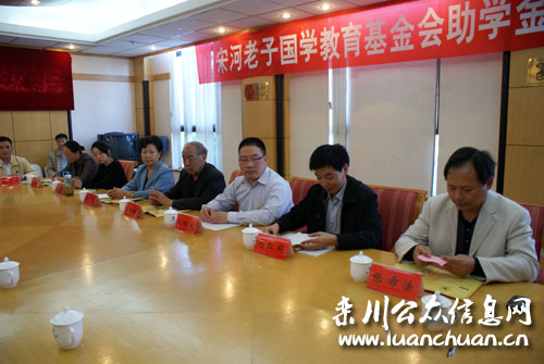 10月8日上午,宋河老子国学教育基金会助学金发放仪式在君山饭店举行。原河南省公安厅常务副厅长、老子国学教育基金会副理事长刘新献,洛阳市人大副主任黄元元、共青团洛阳市委副书记冯红超、共青团洛阳市统战部长高慧君,栾川县委常委、统战部长张希法,共青团县委书记聂艳玲出席仪式。洛阳市实施希望工程办公室负责人及县乡有关单位负责人、受助学生和家长参加仪式。