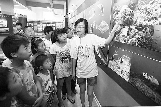 7月9日,来自杭州、金华等地的大学生志愿者,带着结对帮扶的100多名民工子弟,走进海洋科技体验馆。胡社友摄(资料图片)