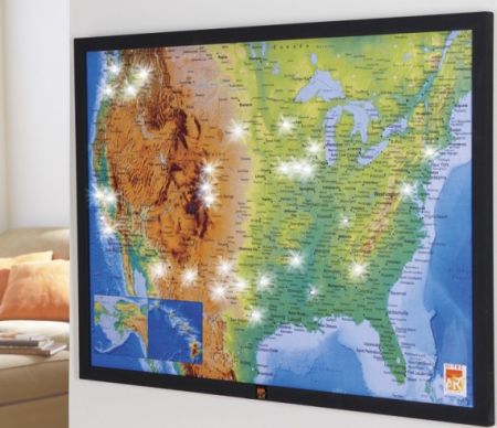 这款大型的地图带有8种颜色共100个LED小灯,方便您地图上将您去过的城市和景点做标记。此外还有两个可以闪耀的小灯是专门为标记您的“故乡”使用的。这款地图精致美观,放在家中或是办公室里都是不错的选择。