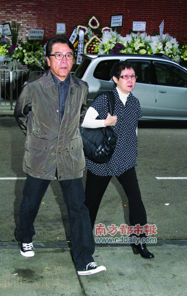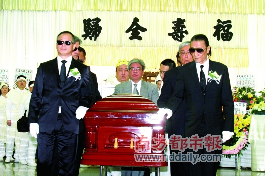 昨日的举殡仪式在早上十时开始。南都记者在现场所见,进行仪式的灵堂挂着“福寿全归、往生净土的”牌匾,现场布置了层层白色帐幕并设有大屏幕播放着天林叔生前片段。纪念仪式中,昔日与天林叔有深厚友谊的台前幕后好友刘天赐、钟景辉及汪明荃都有做致词惜别,灵堂中播着天林叔生前所导、广为大家熟悉的电视剧《啼笑因缘》主题曲,汪明荃在悼词中除了感谢天林叔提携外,也分享了跟对方相处的点滴。大殓仪式约在早上11时进行,王晶披麻戴孝表现甚伤感,在昨日送别父亲时更是两度落泪,在灵堂内不时用纸巾擦拭眼泪。随后,由谢贤、杜琪峰、曾光、陈木胜、刘松仁、游乃海、黄日华、林岭东一行八人组成的扶灵队伍步出灵堂,然后天林叔的遗体被送往火葬场火化,值得一提的是,天林叔生前的经典之作电视《楚留香》中的经典歌曲也作为送殡歌曲,其中一句“千山我独行不必相送”更显天林叔的豪气及乐观豁达。
