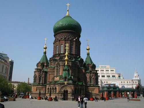 圣索菲亚教堂位于哈尔滨市内,是远东地区最大的东正教堂,通高53.35米,占地面积721平方米,是拜占庭式建筑的典型代表。始建于1907年3月,是沙俄东西伯利亚第四步兵师修建的随军教堂。后被重新修建为一座全木结构教堂。