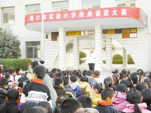 12月9日,周口市实验小学举行“经典诵读”比赛活动,全校1800多名学生参加此次活动。活动的开展进一步弘扬了中华传统文明,提升了学生的文化素质和道德修养,培养了学生的爱国情感和民族自豪感,推动了“书香校园”的创建工作。(杜威 应亚丽 摄)
