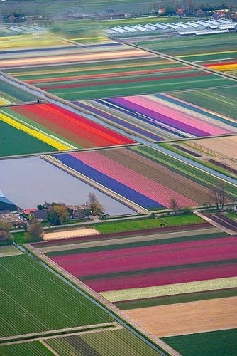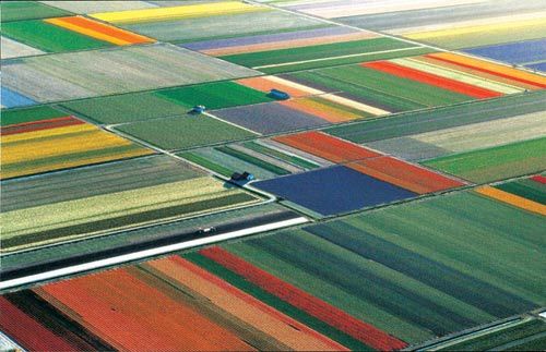 朵朵娇艳的郁金香和风信子,一时间都化成了井然的多彩方格和一道道地上彩虹。飞机由北向南飞,沿途除了缤纷的花田,还有翠绿的田园、堤坝以及蔚蓝的北海,不时偶有风车、农庄、小城堡等点缀其间。