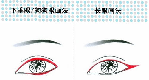 下垂眼需要将原本正常上翘的眼尾弧度变得平缓,因此需要从下眼睑1/2处开始向眼尾画出逐渐加粗的下眼线,眼尾与上眼线以圆润的线条过渡融合,即可打造出眼角垂坠感十足的狗狗 眼了。