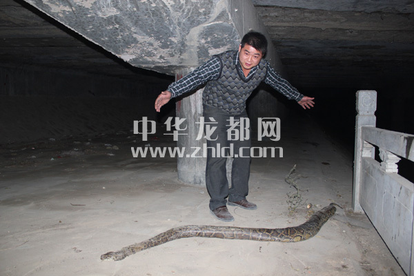 记者赶到现场时,发现蟒蛇已经被人拖到桥下的水泥地面放平。记者仔细观察发现,这条蟒蛇长2米多,腹部碗口般粗大,背面呈棕褐色,体表分布着云豹状的花纹,头、颈部的皮还没有完全蜕下,腹部、尾部各有一处明显的伤疤,肌肉裸露,身体其他部位有许多红、紫相间的伤痕。