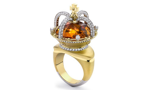 Theo Fennell善于找乐子,这一次,他对风靡全球、大受追崇的皇室婚礼排场表示不屑。对于那些自我感觉配得上金光闪闪的皇室珠宝的人们而言,Theo Fennell提供了皇冠戒指系列供其选择。对Theo Fennell来说,每件珠宝杰作均是为那些崇尚趣味性以及青睐传统的人们精心打造的。这些珠宝比茶巾或婚礼杯更有品味。