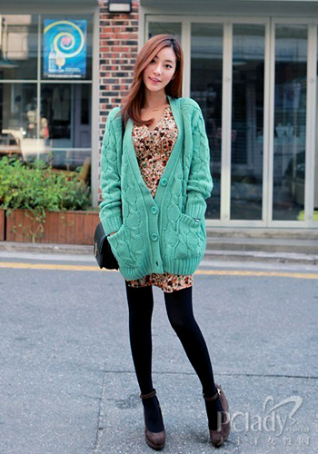古着的毛衣是当季的热门必买单品,不需要过多的花样设计,只要颜色变化,哪怕整体都是黑色搭配也是绝对不会出错的,碎花的连衣裙和黑色裤袜形成鲜明对比,麻花编织粗线毛衣外套才是真正的主角