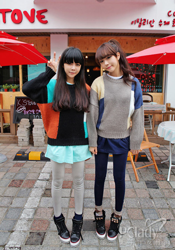 现在流行的姊妹装要学习哦!情侣张都是浮云,同样的搭配:用宽大的T恤做了基础打底,颜色的选择很重要,打底裤+厚底运动运,可以变长腿哦!拼色蝙蝠袖套头毛衣外面可以根据天气搭配休闲外套或者复古的大西装做搭配