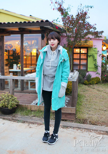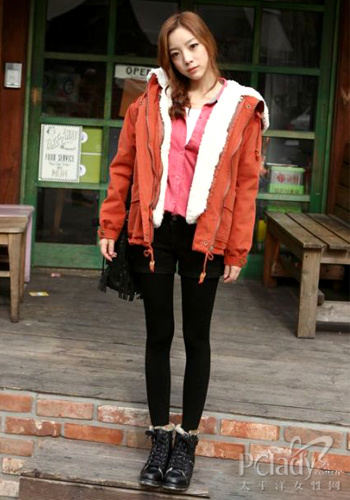 不要在军绿色、黑色、驼色之类的了!太OUT了!准备一件自己能完全驾驭的炫彩棉服吧!谁说冬天不能像夏天一样彩色呢!白色T恤打底+红色卫衫,黑色裤袜搭配同色短裤,腿部变长有木有!深橘色内胆抓绒棉服无论型还是温度都绝对Hold的住,短靴和包包上下呼应