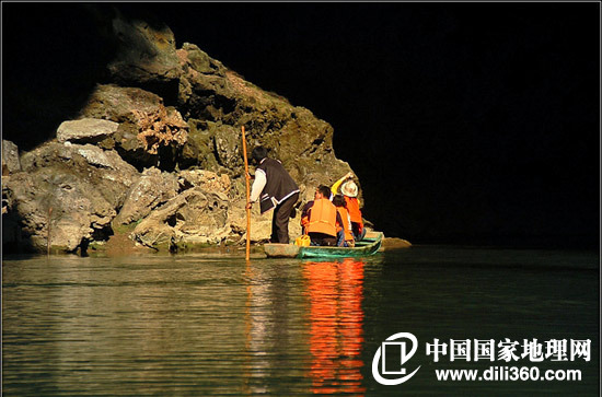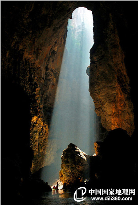 乘上小船缓缓行驶入洞,初时还有微弱的光线,越往内越暗终至伸手不见五指,只感到清冷的凉风扑面袭来,听到惊飞的乳燕或蝙蝠扑刺跌入水中,耳边的高处石筝滴答水滴声,脚下飘飘地仿佛踏在空中。我在漆黑中感到船微微的拐向,忽然前面豁然开朗,一束亮光从顶上一个“天窗”蓦然倾盆注入。亮光所到之处,只见两壁怪石嶙峋,右侧伸出的石笋像张牙舞爪的怪兽,仿佛叫嚣着要把前方的小船吞没。那一刹非常震撼,我下意识地按下快门……
