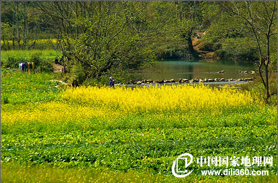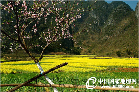 再次上船穿越一个个的岩洞,尽是喀斯特地貌的奇特山势包裹下的小片腹地。平缓的地方种植良田,金灿灿的油菜花与绿油油的青菜交相辉映。