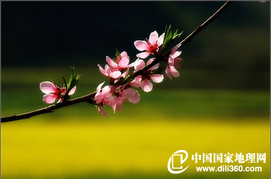 小船继续前行,共计约1公里的水路,终于出了洞口。我们在一座水车旁登上陆地,预期中游人熙攘的境况并没有出现。山边大片的田野俱是金灿灿的油菜花,崭新显然刚铺设没多久的水泥路通往远方的房舍,夹道栽种的桃花娇艳欲滴,果然是世外桃源……