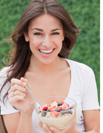 肌肤处方:吃一点点脂肪。“至少有20%的热量要取自脂肪,主要是不饱和脂肪,”纽约市皮肤科专家Cheryl Karcher医学博士说。使用橄榄油煎炒蔬菜,再撒上一些坚果,制作成美味的沙拉,并且要坚持食用富含omega-3脂肪酸的鲑鱼,亚麻籽,还要偶尔给自己加个鸡蛋。植物油中所含的亚油酸,对皮肤屏障起到至关重要的作用,在保证肌肤水润的同时,缩减肌肤对外界的刺激性