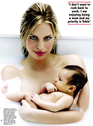 而时尚界对于这些辣妈更是宽容鼓励甚至还带着点推崇,可不是,无论是Miranda Kerr还是Adriana Lima,生完孩子一回伸展台,老东家要不就给个第一位出场要不就给穿个超级贵的钻石Bra。如果说你以为是老东家给个情面的话,那就来看看《Elle》美国版2011年10月号封面吧!登场的4位名模Adriana Lima 、Miranda Kerr、Doutzen Kroes和Chanel Iman中,前三位都已经是孩子他妈了。