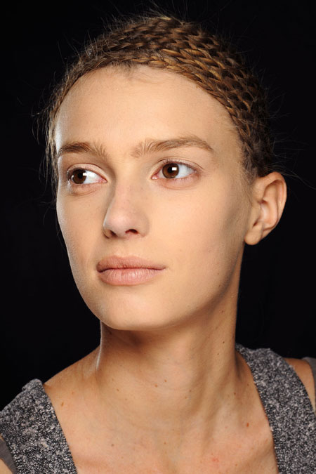 亚历山大 麦昆 (Alexander McQueen) 2012春夏女装秀场妆容淡雅简单,仿若未经雕琢过的素颜肌肤,彩妆师Peter Philips打造出质感细腻的哑光肌肤和粉金色唇妆。发型方面,创意顾问Guido Palau挑战了高难度螺旋式多层麻花辫造型。模特们的秀发由上至下被分成若干区域,逐一编成麻花辫,沿着头部轮廓成螺旋形环绕,然后被包裹在由Guido Palau设计的34款黑色、白色、金色等不同色彩的蕾丝头饰之下,与Alexander McQueen女装中的不同服装搭配,精致的花纹和奇特的造型吸引了全场的注意力
