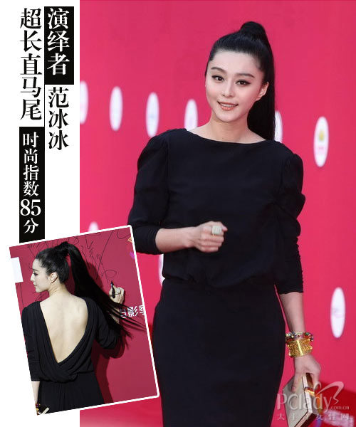 演绎心机:范冰冰这款帅气的马尾充满了独属于东方神秘的美感,柔顺黑亮的秀发是最好的装饰。高耸的马尾绑紧后将一部分头发缠在马尾根部,走动起来颇有几分侠女的风范。可惜这款发型实在是太挑人了,不仅要求脸型够小,而且五官也要足够出挑才能驾驭,虽然效果确实很好,但是鉴于普及度不高,只能停留在85分的时尚指数了