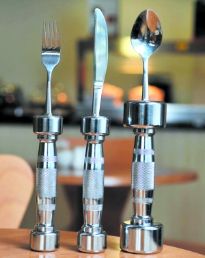 据英国媒体报道,一家英国公司开发出的这套餐具共32种,其中刀叉的手柄都是重达一公斤的镀铬哑铃,而勺子则特别重,为两公斤。