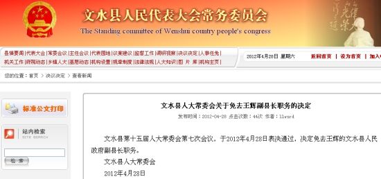 山西文水县人大网站关于免去王辉职务的决定(网站截图)