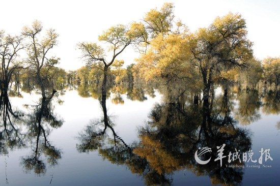 青海格尔木:格尔木的胡杨林生长在昆仑山脉和茫茫戈壁盐滩之间的沙漠化地带里,因此显得尤为珍贵。林中生长着芦苇、红柳、盐爪爪、骆驼刺等沙生植物,与栖息的野生动物一起,伴随着古老的胡杨。