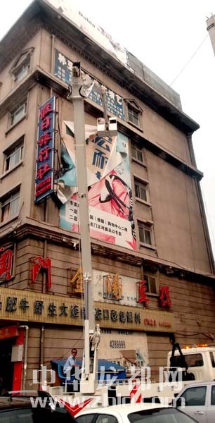 10月16日,记者在项城市区商城路看到,一辆高空作业车正在清除一个楼体立面广告牌(如图)。项城市城管局户外广告管理处负责人陈中林说:“街道两边未经规划、随意悬挂的户外广告牌又脏又乱,就像一块块‘牛皮癣’。这次我们下决心对其进行强制拆除!”