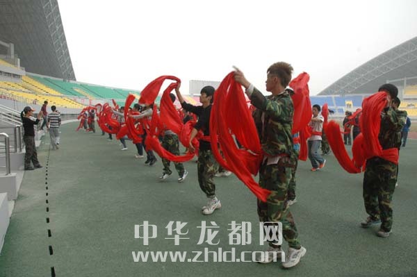 10月20日起,周口市第二届运动会开幕式文体表演开始在市体育中心体育场现场排练。26日晚,这里将进行开幕式文体表演的第一次带观众彩排。图为昨天下午,群众演员排练红绸舞。