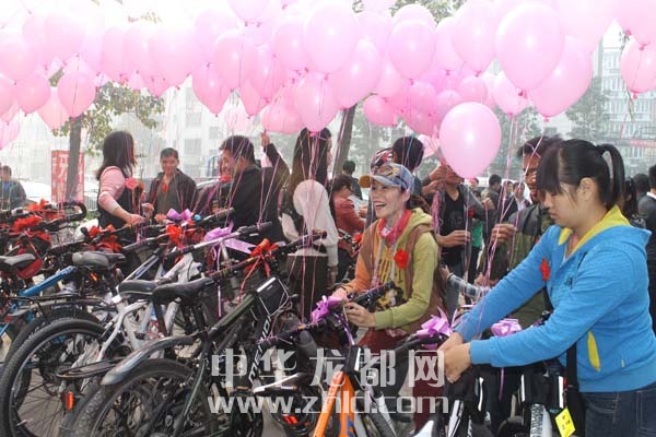 10月20日一早,周口市区七一东路老卫生局家属院门前,新郎李勇正在为自己的婚礼不停忙活。一辆扎满花束的马车作为婚车,近50辆单车的车把上也被骑友们仔细地绑上粉色的气球和彩带(如图一)。新郎李勇和新娘陈小飞的浪漫单车婚礼在当日如期举行,并取得圆满成功。