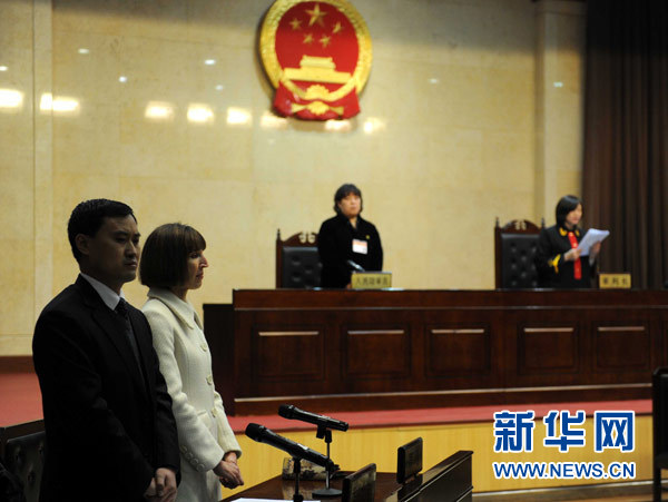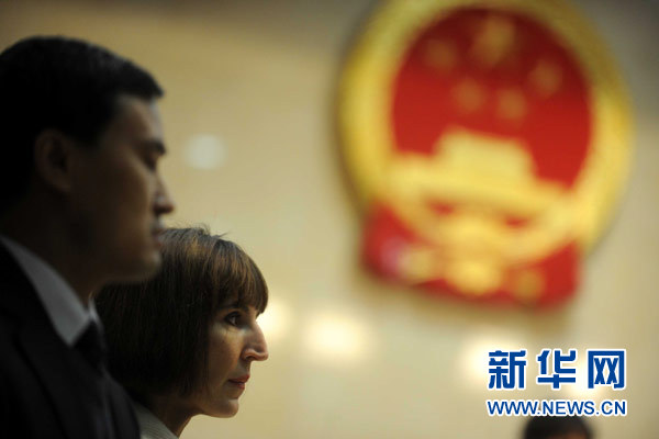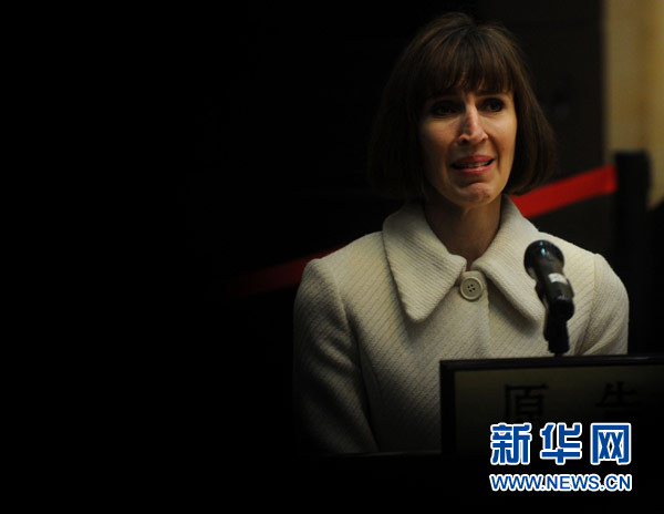 2月3日,李金在法庭上。当日,备受社会关注的“疯狂英语”创始人李阳离婚案在北京市朝阳区法院宣判。法院认定李阳家庭暴力行为成立,判决准予李阳和妻子李金离婚。法院宣判前还依李金申请作出为期3个月的人身安全保护裁定。法院审理认为,李阳于2011年8月对李金实施的殴打行为属于家庭暴力行为,因此判决李阳向李金支付5万元的精神损害抚慰金。此外,法院从有利于子女健康成长、保障子女合法权益的角度出发,判决三个女儿由李金直接抚养,李阳需按每人每年人民币10万元的标准向三个女儿支付抚养费,直至她们分别年满18周岁;最后,法院判决李阳于判决生效之日起3个月内向李金支付财产折价款1200万元。 2011年8月底,李阳妻子李金在微博上公开曝光李阳对她实施家庭暴力,并公布了数张照片为证。当年10月下旬,李金正式向朝阳区法院起诉与李阳离婚,要求直接抚养三个子女,并分割夫妻共同财产。据了解,因双方就子女抚养、财产分割及李阳是否重婚存在争议,此案曾先后开庭4次。新华社记者 公磊 摄