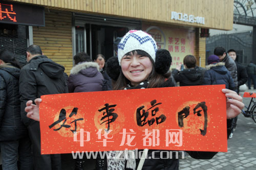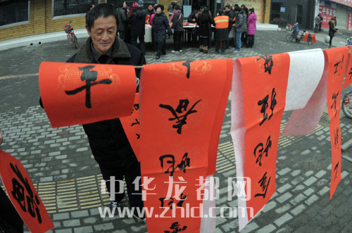 义写春联活动现场,简易的写字台前挤满了闻讯赶来的群众。他们有的正在仔细挑选自己喜爱的春联;有的在一旁帮义写春联的书法爱好者铺纸、压纸;有的在晒墨迹还未干透的春联。一副副洋溢着节日喜庆和墨香的春联一“出炉”,就被现场热情的市民“抢走”。