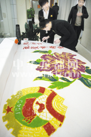 没有鲜花,在周口饭店自助餐厅门口,工作人员用小米染成不同颜色在餐桌布上制作沙画庆祝市两会召开,这些小米以后还可以继续煮饭。