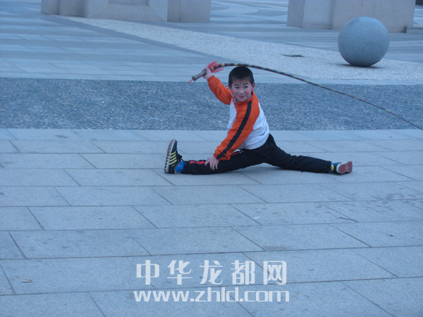 正式表演开始前,由彭川旭为爷爷彭俊红“暖场”。耍了一套花鞭,气喘吁吁的彭川旭加大了动作难度,一边“劈叉”一边甩鞭(如图二),引来围观者的阵阵喝彩。“暖场”结束,爷爷彭俊红才拿起重40斤、长6米的铁鞭舞动起来,强大的“气场”让围观者纷纷急忙后退,甚至不少人被铁鞭发出的巨响震得捂住了耳朵。表演结束后,彭俊红休息了一下,才表示:“我下一个目标是舞动60到80斤的铁鞭,现在世界纪录是108斤,不知道有没有机会打破它。”