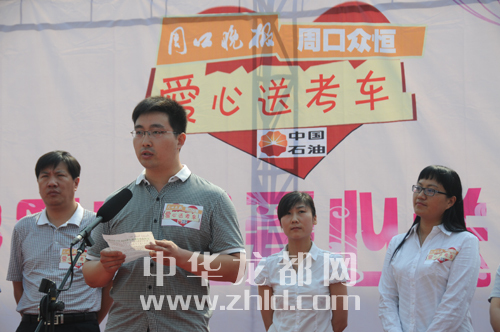 昨天的启动仪式上,中国石油河南销售周口分公司副总经理郭红卫代表爱心企业发言(如图)。他说:“能和周口晚报、众多爱心企业一起为高考考生做点事,十分荣幸。”
