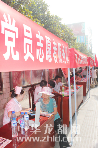 6月27日,周口市直机关工委组织市中级法院、市工商局、市食品药品监管局等16家单位的近百名党员志愿者,带着与市民生活休戚相关的法律法规条文、办事便捷程序等便民信息,在周口市区七一中路上“摆摊”服务市民。晚报记者 徐松 摄