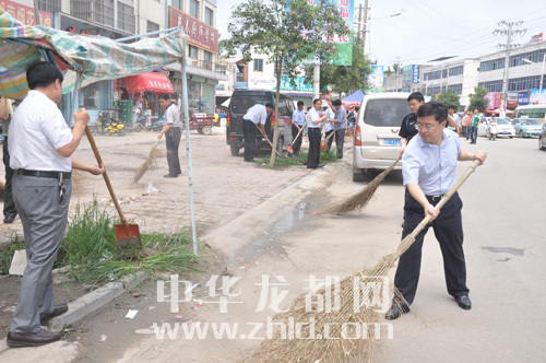 县领导在分包卫生区吉祥西路带头参与卫生清洁工作。