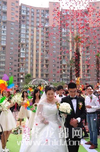 本报讯 迎新娘的花车是房地产商免费提供的电动看房车,迎亲车队是电动自行车车队,社区的景观广场是举办婚礼的礼堂,亲朋和邻里的掌声取代震耳的鞭炮和礼炮声……10月20日上午,新郞杨旭、新娘刘洋的新婚庆典在周口市川汇区文昌大道幸福花开小区举行(如图)。据悉,这种“社区婚礼”在周口尚属首次。