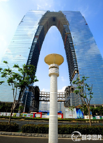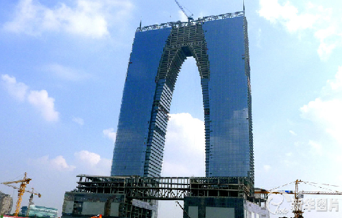 据悉,矗立于苏州工业园区金鸡湖西岸、气势恢宏的“东方之门”,相当于法国凯旋门的6倍,被誉为“世界第一门”,总高度为301.8米,其幕墙规格近百种共需16万立方米,平铺占地面积约有15个标准足球场大,该工程预计2014年底整体完工。